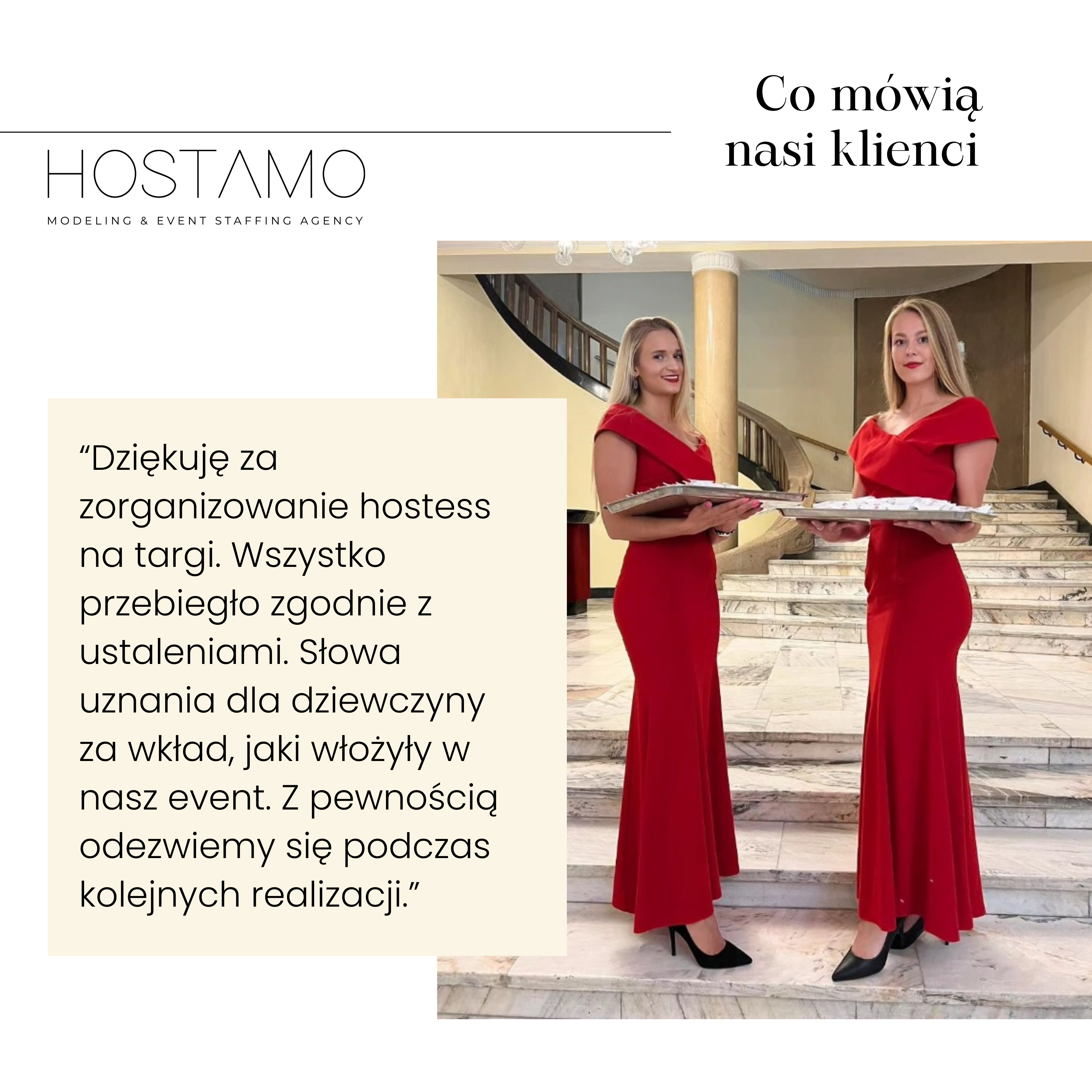 Współczesna hostessa to połączenie piękna, przebojowości, taktu i inteligencji. Hostamo to nowatorska agencja hostess, która wierzy, że to idealna mieszanka, gwarantująca sukces każdej imprezy. Profesjonalna hostessa posiada także umiejętność adekwatnego zachowania się w sytuacjach nieprzewidzianych. Jako perfekcjoniści, dbający o pozytywny wizerunek swoich klientów, zatrudniamy jedynie wykwalifikowane oraz doświadczone hostessy. Ponadto proponujemy Państwu skorzystanie z usług naszych wysokiej klasy hostów, modeli, modelek, promotorów, animatorów, tancerzy, fordanserek i konferansjerów. W swojej karierze wielokrotnie uczestniczyli oni w ważnych wydarzeniach branżowych, konferencjach, bankietach i galach. Warto podkreślić, że nasze hostessy znają języki obce. Współpracujemy wyłącznie z obowiązkowymi osobami, których rzetelność nie budzi naszych wątpliwości. Każda zatrudniona przez nas hostessa czy inna osoba z zespołu gwarantuje pełne zaangażowanie podczas realizacji powierzonego zadania.